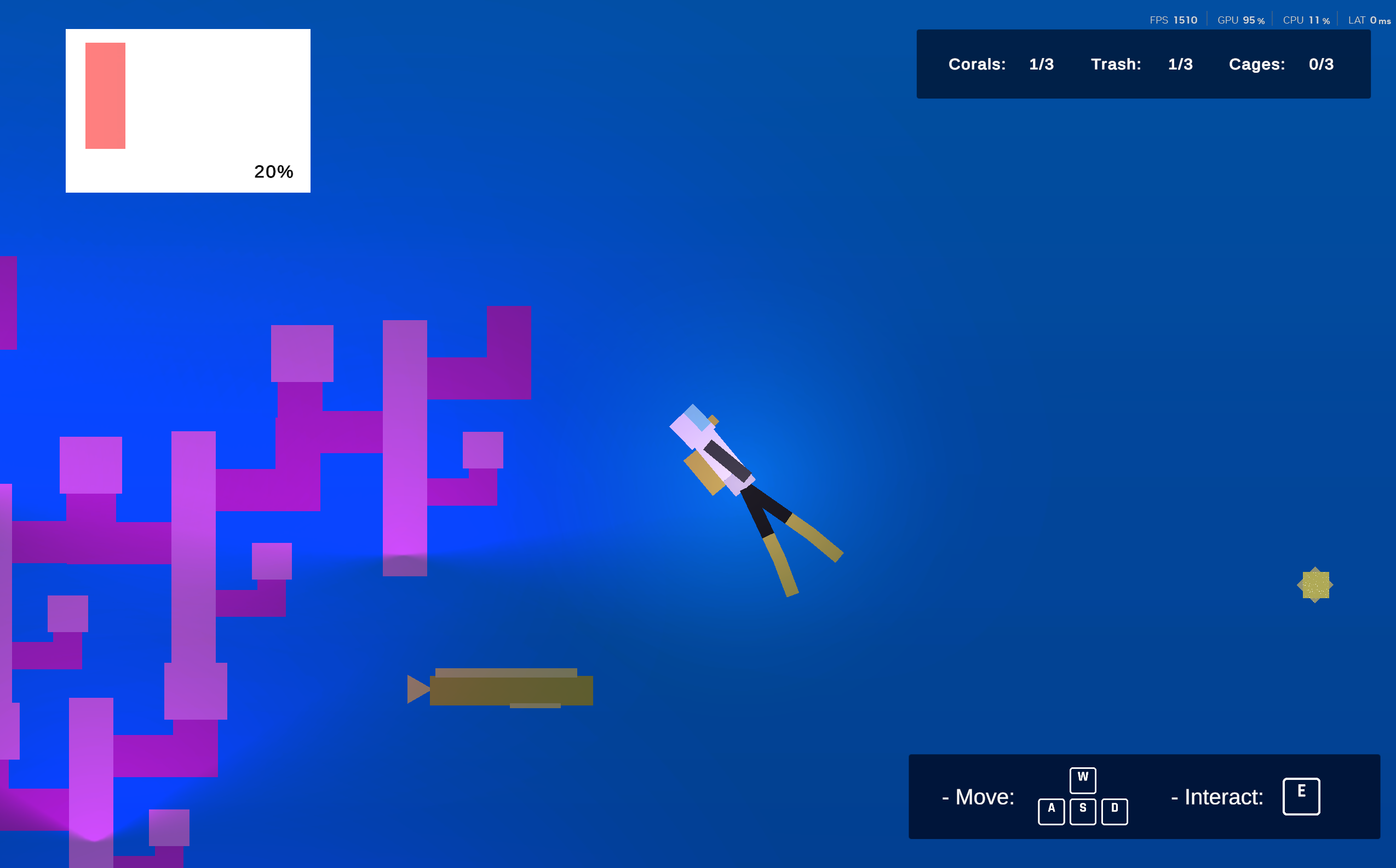 Mero Project aims to raise awareness about the pollution and explotation reefs at the Canary Islands coast. It's a 2D Voxel-Style game where you play as a diver tasked with cleaning a coastal area. Available for both controller and keyboard/mouse, explore this small reef while cleaning and freeing various animals trapped by pollution.